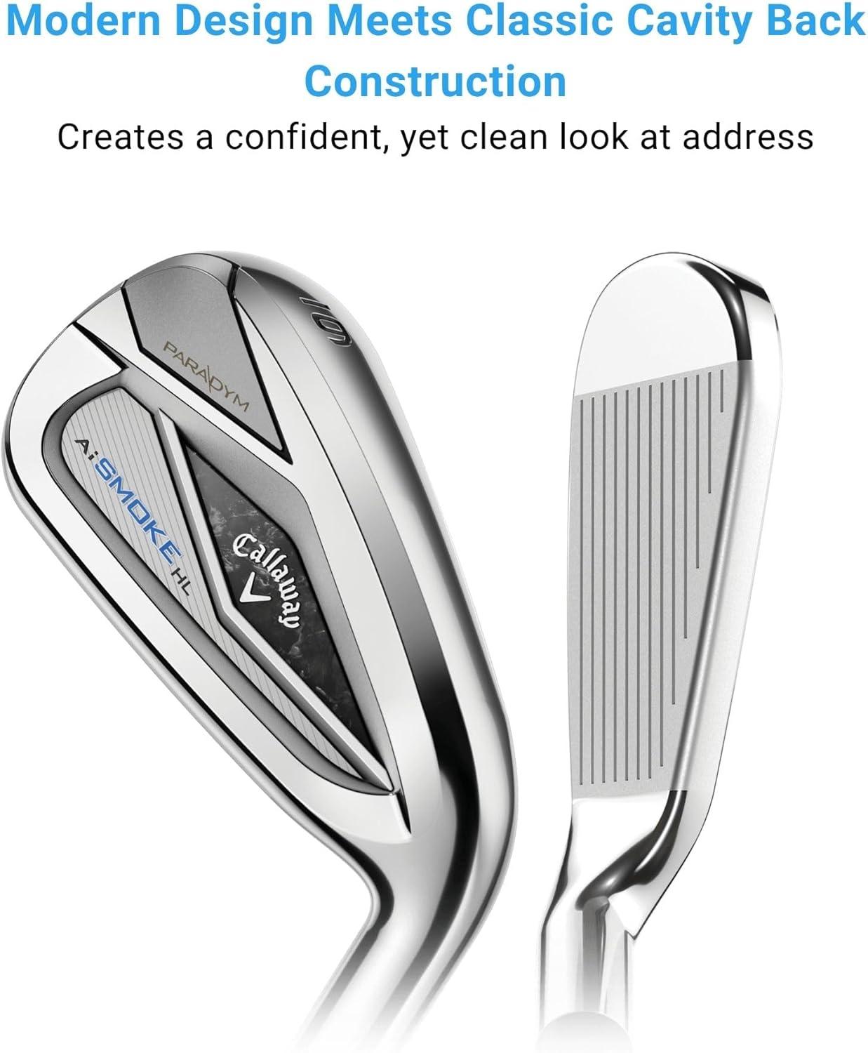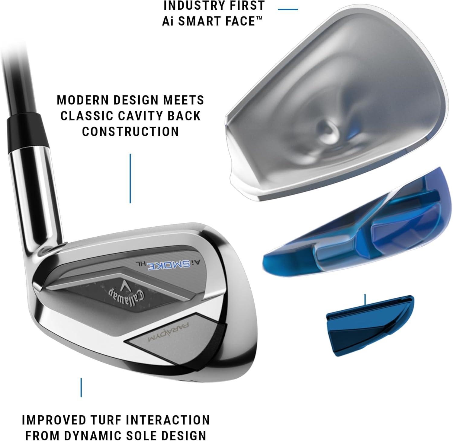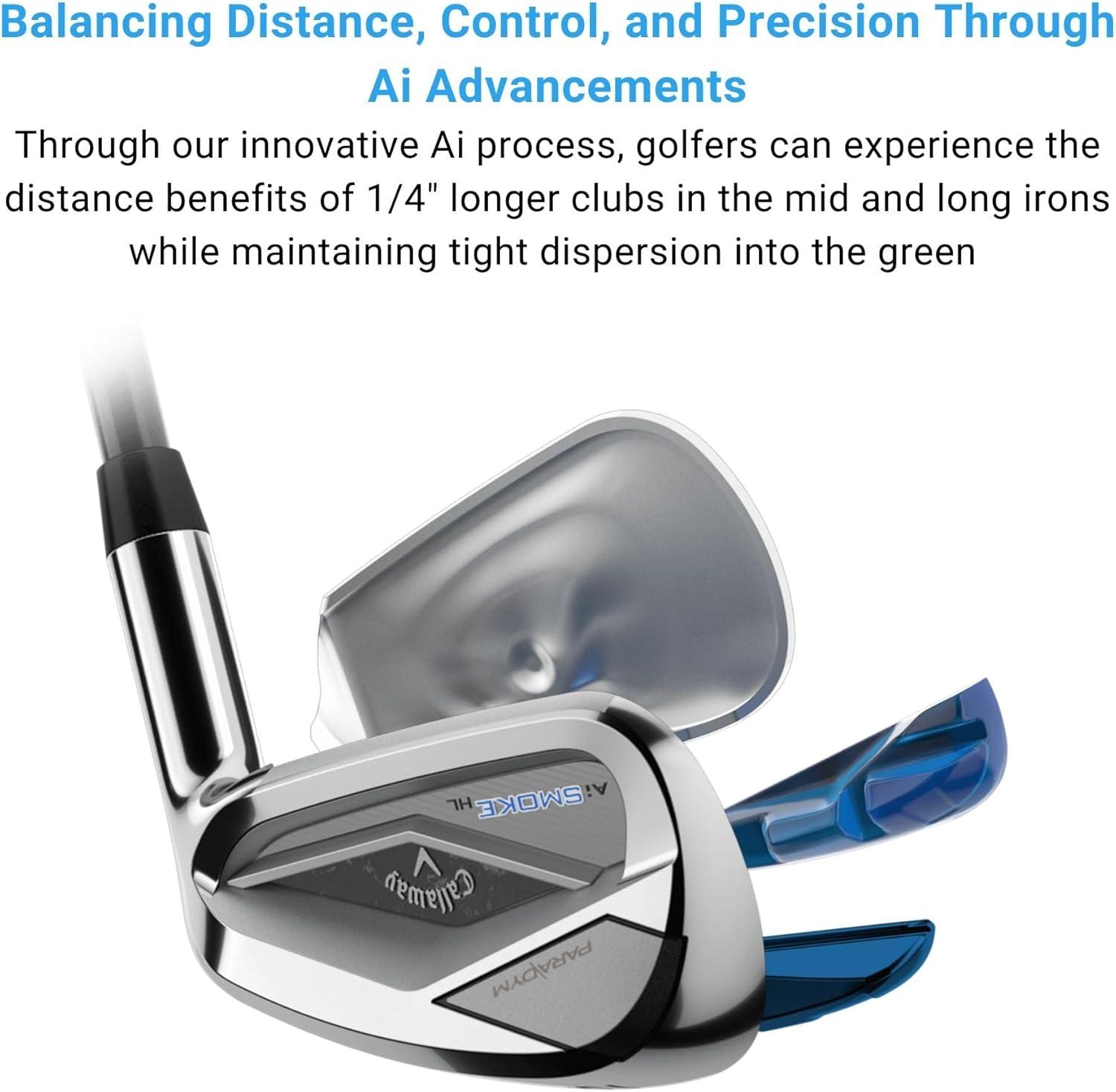 The Paradym Ai Smoke irons represent a total revolution in iron performance. The Ai Smoke family of irons utilizes the most advanced iron face in Callaway history: the Ai Smart Face. The Ai Smart Face is designed using real player data and advanced machine learning to create a series of sweet spots all over the face. The result is exceptional distance with improved dispersion. The HL (High Launch) model is made for golfers who need higher launch to maximize distance and hit more greens.