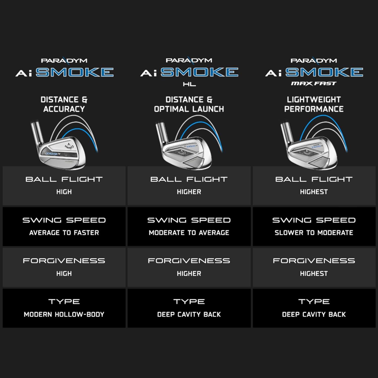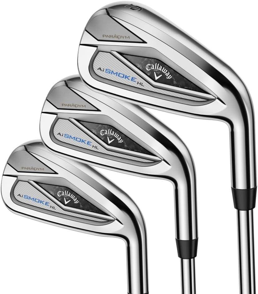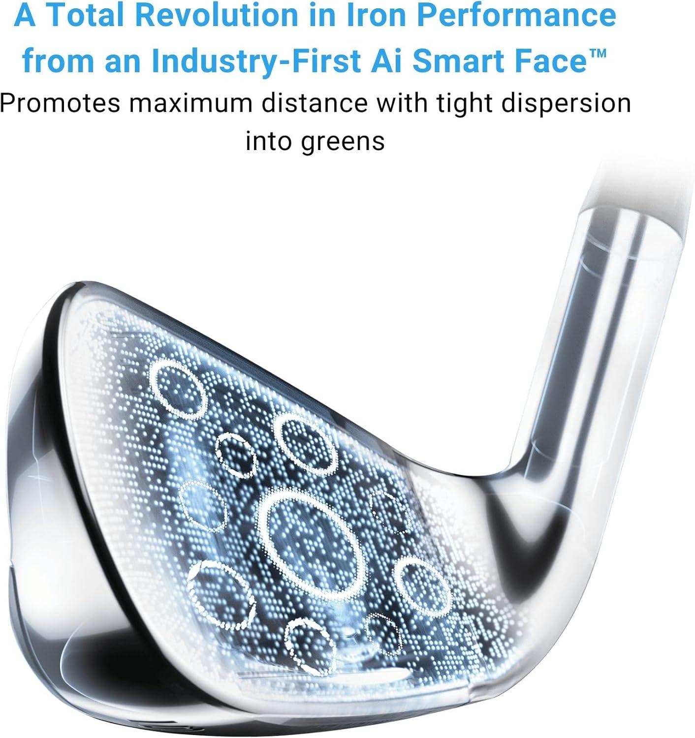 The Paradym Ai Smoke irons represent a total revolution in iron performance. The Ai Smoke family of irons utilizes the most advanced iron face in Callaway history: the Ai Smart Face. The Ai Smart Face is designed using real player data and advanced machine learning to create a series of sweet spots all over the face. The result is exceptional distance with improved dispersion. The HL (High Launch) model is made for golfers who need higher launch to maximize distance and hit more greens.