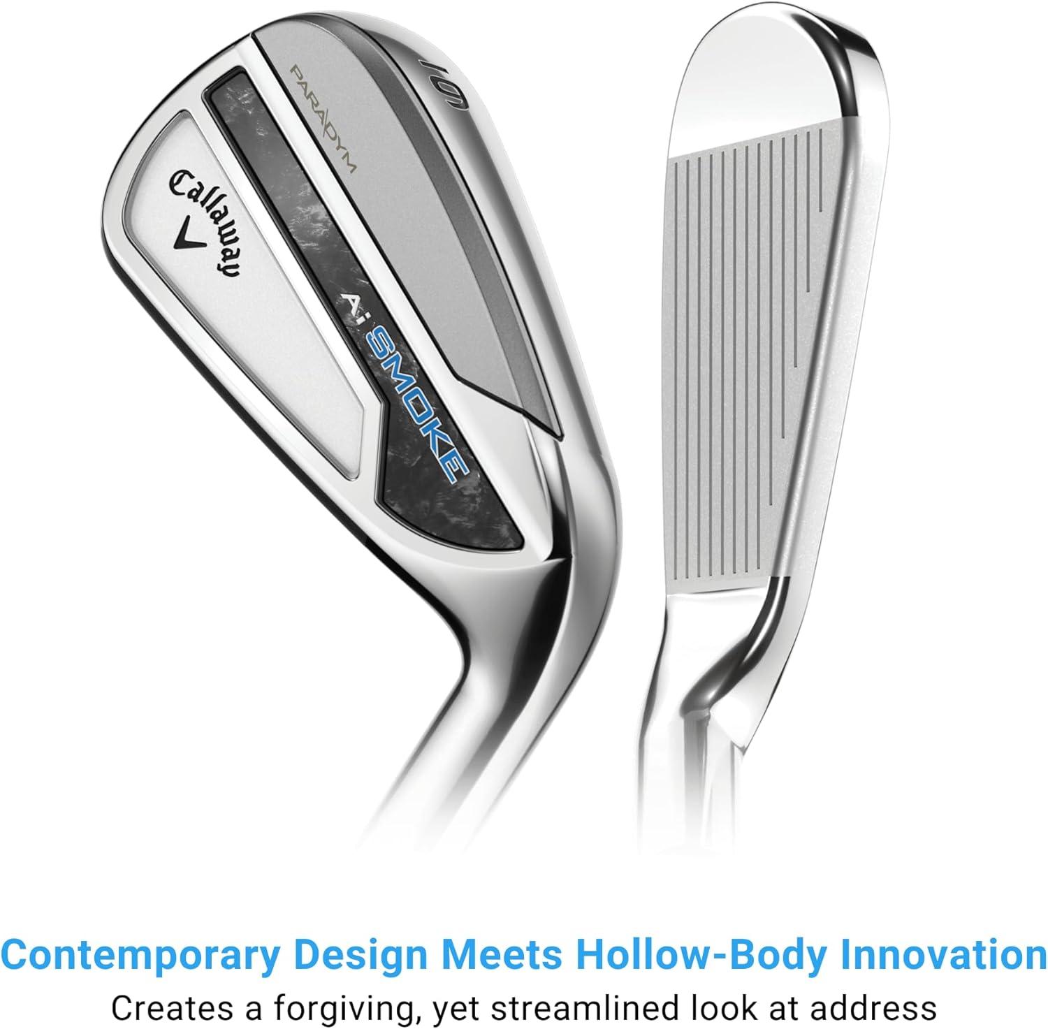The Paradym Ai Smoke irons represent a total revolution in iron performance. The Ai Smoke family of irons utilizes the most advanced iron face in Callaway history: the Ai Smart Face. The Ai Smart Face is designed using real player data and advanced machine learning to create a series of sweet spots all over the face. The result is exceptional distance with tight dispersion. The Paradym Ai Smoke model is best suited for golfers with average to high swing speeds looking to maximize distance and improve dispersion.